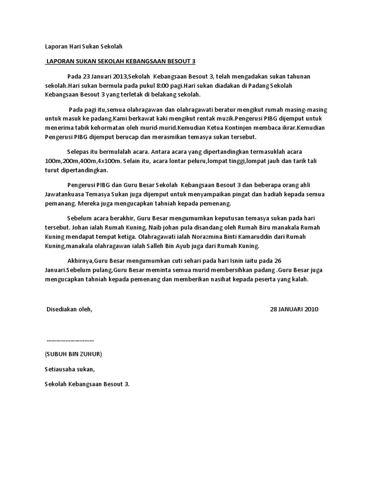 Anda dikehendaki menyediakan laporan tentang temasya sukan tahunan yang dijalankan di sekolah kamu. Siti aja karangan contoh. Contoh Karangan Laporan Hari Sukan - Contoh laporan sukan tahunan 1.