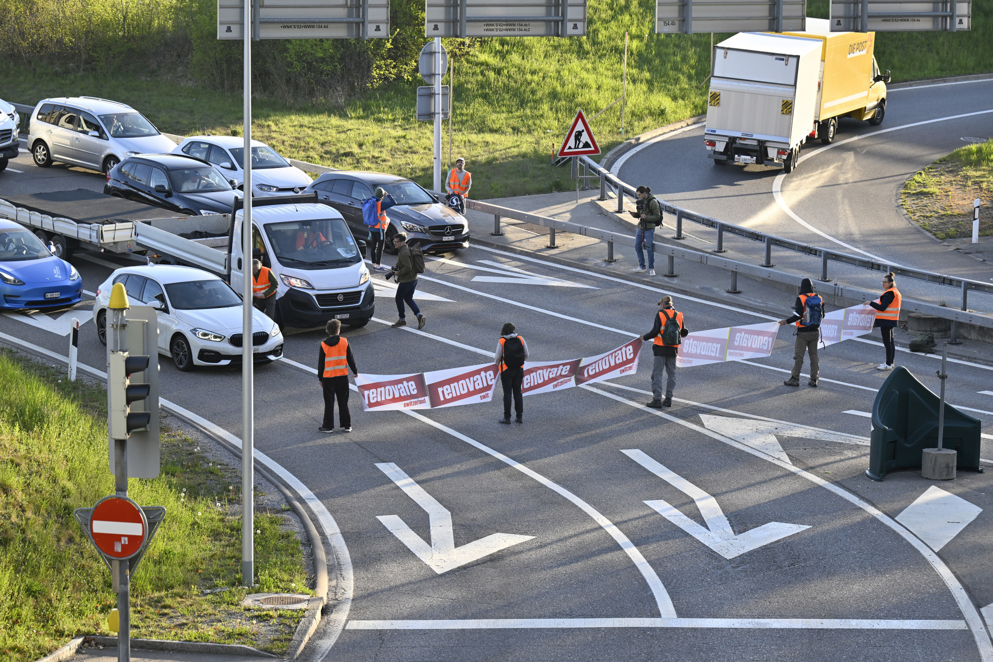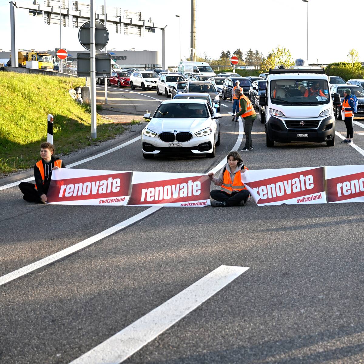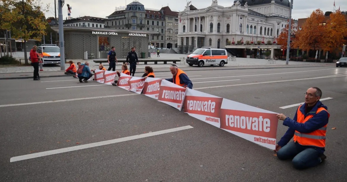 Four activists sat down on the road. Renovate Switzerland is a self-proclaimed campaign of civil resistance similar to Extinction Rebellion and Insulate UK in tactics and strategy.