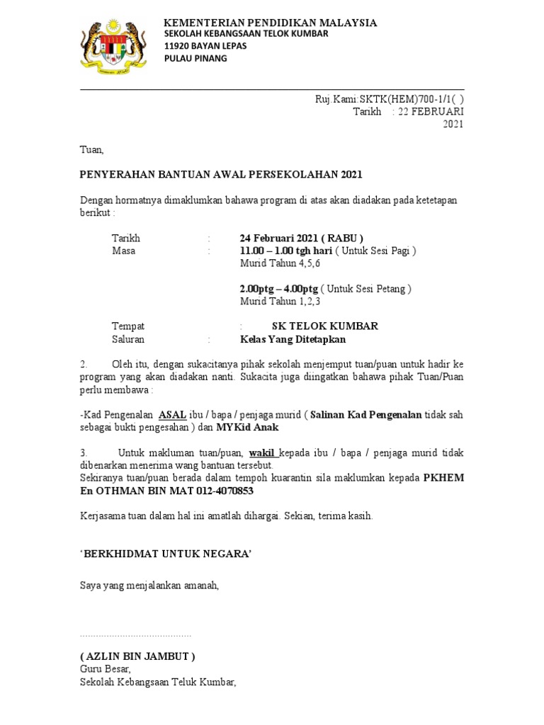 Surat Ibu Bapa Penyerahan Bantuan Awal Persekolahan Sktk 2021 Pdf
